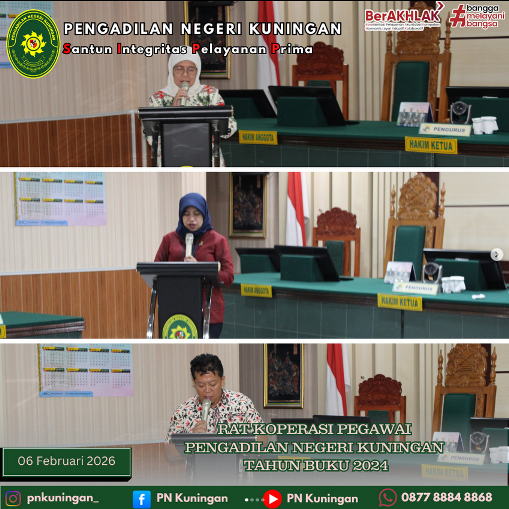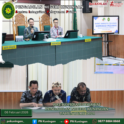 Bertempat di Ruang Sidang Ali Said Pengadilan Negeri Kuningan Telah dilaksanakan Acara RAT Koperasi Pegawai Pengadilan Negeri Kuningan Tahun Buku 2024, yang dihadiri oleh Ibu Tavia Rahmawati Suki, S.H, M.H selaku Ketua Pengadilan Negeri Kuningan di dampingi oleh Bapak Muhamad Hidayatullah, S.H, M.H selaku Wakil Ketua Pengadilan Negeri Kuningan beserta Para Hakim Pengadilan Negeri Kuningan dan Dinas koperasi, UKM, Perdagangan dan Perindustrian (Diskopdagperin) Kab. Kuningan, Dewan Koperasi Daerah (Dekopinda) Kab. Kuningan, Dan Seluruh Anggota Koperasi Pengadilan Negeri Kuningan