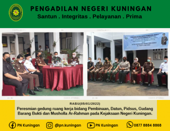 Ketua Pengadilan Negeri Kuningan diwakili oleh Nanang Adi Wijaya,S.H.,M.H. Hakim Pengadilan Negeri Kuningan, Beserta Forum Koordinasi Pimpinan Daerah dan Undangan lainnya menghadiri Undangan Peresmian Gedung ruang kerja bidang pembinaan, Datun, Pidsus, Gudang Barang Bukti dan Musholla Ar-Rahman pada Kejaksaan Negeri Kuningan.