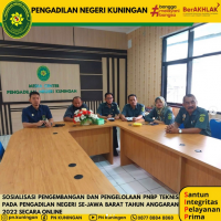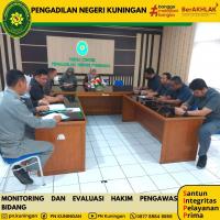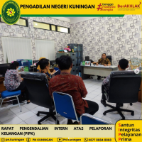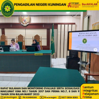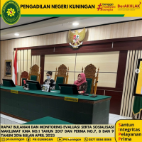 Jumat (14/04/2023) Rapat Bulanan dan Monitoring Evaluasi serta Sosialisasi Maklumat KMA No.1 Tahun 2017 dan PERMA No.7, 8 dan 9 Tahun 2016 Bulan April 2023 dipimpin oleh Ketua Pengadilan Negeri Kuningan Ibu Lusiana Amping, S.H.,M.H dan didampingi oleh Wakil Ketua Pengadilan Negeri Kuningan Ibu Ardhianti