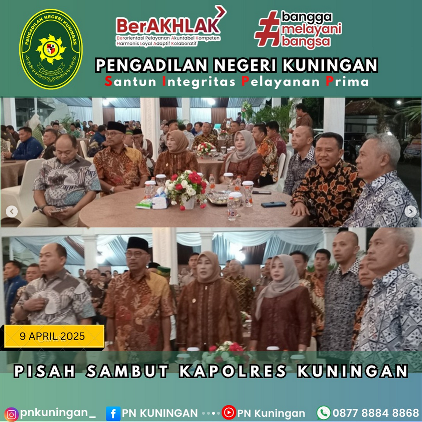 Ketua Pengadilan Negeri Kuningan Ibu Ardhianti Prihastuti, S.H., M.H. menghadiri Acara Pisah Sambut Kapolres Kuningan dari Ajun Komisaris Besar Polisi Willy Andrian, S.H., S.I.K., M.H. kepada Ajun Komisaris Besar Polisi Muhammad Ali Akbar, S.I.K., M.Si. bertempat di Pendopo Kabupaten Kuningan.