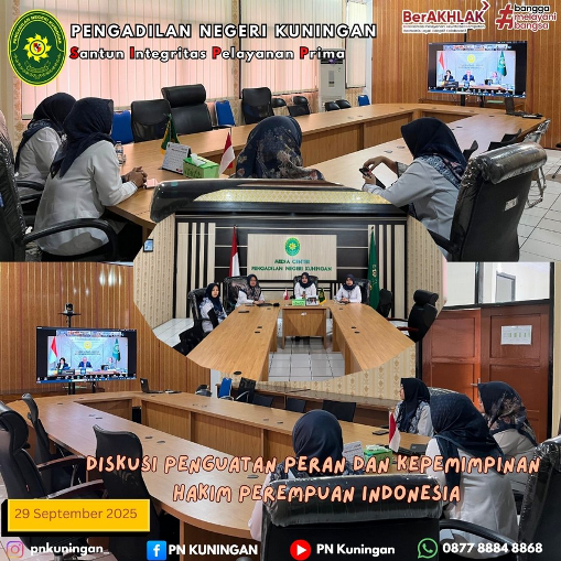 Ibu Ardhianti Prihastuti, S.H., M.H., selaku Ketua Pengadilan Negeri Kuningan dan didampingi oleh Ibu Tavia Rahmawati Suki, S.H., M.H., Selaku Wakil Ketua Pengadilan Negeri Kuningan dan Para Hakim Perempuan mengikuti Diskusi Penguatan Peran dan Kepemimpinan Hakim Perempuan Indonesia secara daring yang bertempat di Ruang Media Center Pengadilan Negeri Kuningan