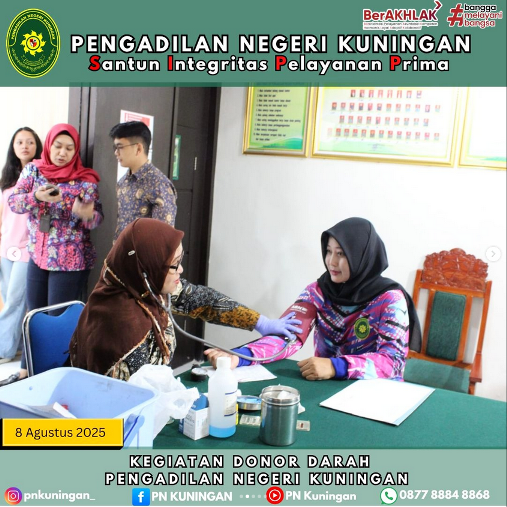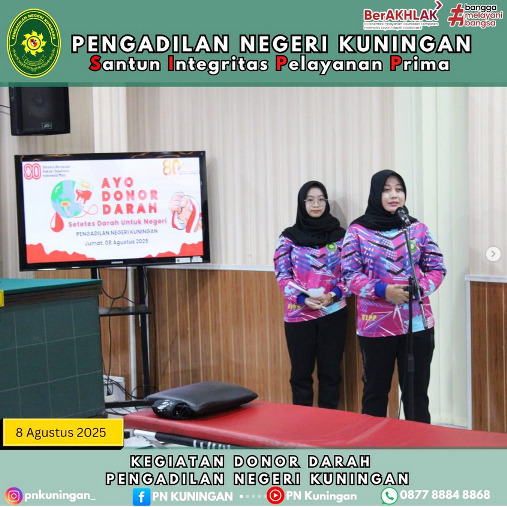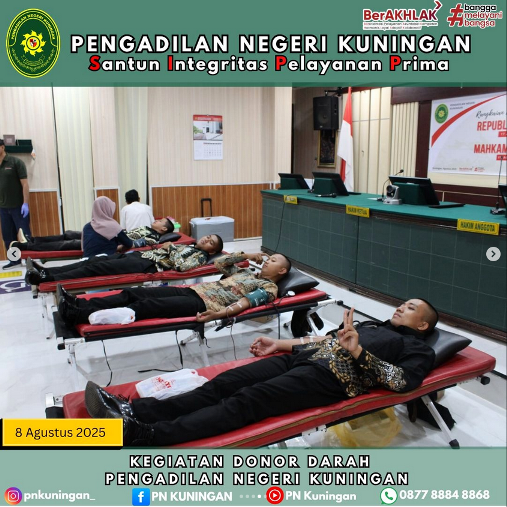 Pengadilan Negeri Kuningan bekerjasama dengan PMI Kabupaten Kuningan mengadakan kegiatan Donor Darah dalam rangka kegiatan memperingati Hari Ulang Tahun Kemerdekaan Republik Indonesia dan Hari Ulang Tahun Mahkamah Agung Republik Indonesia ke 80