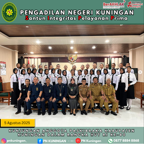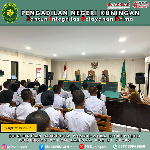 Ibu Ardhianti Prihastuti, S.H., M.H., selaku Ketua Pengadilan Negeri Kuningan didampingi oleh Hakim, Panitera dan Sekretaris Pengadilan Negeri Kuningan menerima Kunjungan dari Anggota Paskibraka Kabupaten Kuningan dalam rangka persiapan HUT RI ke-80 bertempat di Ruang Sidang Subekti Pengadilan Negeri Kuningan.