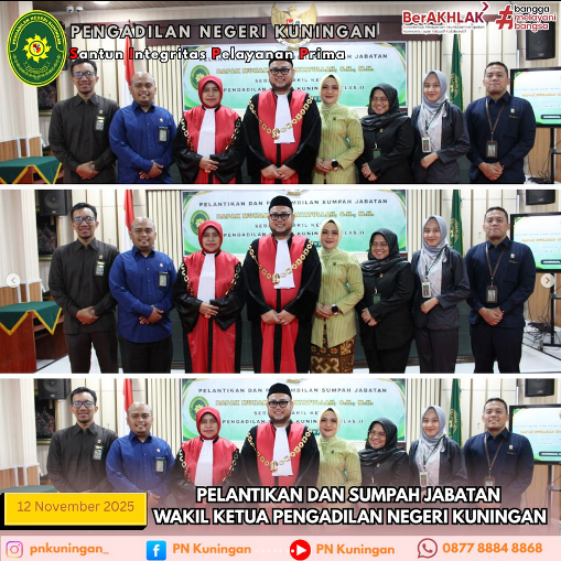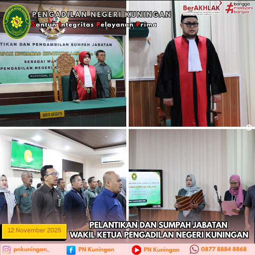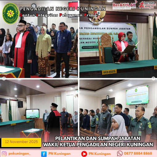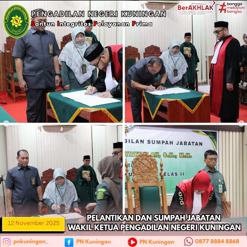Telah dilaksanakan Pelantikan dan Pengambilan Sumpah Wakil Ketua Pengadilan Negeri Kuningan Bapak Muhammad Hidayatullah, S.H, M.H oleh YM Ibu Tavia Rahmawati Suki, S.H, M.H selaku Ketua Pengadilan Negeri Kuningan yang bertempat di Ruang Sidang Ali Said Pengadilan Negeri Kuningan