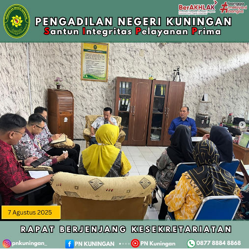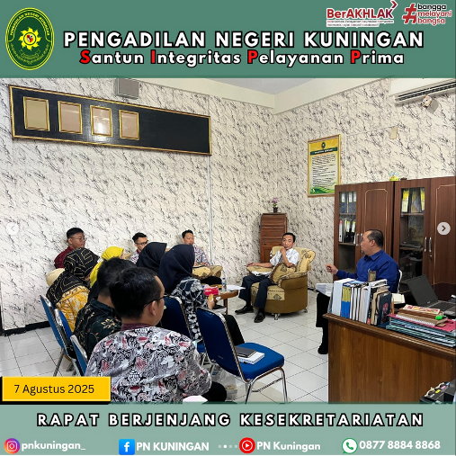 Bapak Jundy Eka Saputra, S.E.,M.M., selaku Sekretaris Pengadilan Negeri Kuningan memimpin Rapat Berjenjang Kesekretariatan bulan Agustus 2025 bertempat di Ruang Sekretaris Pengadilan Negeri Kuningan.