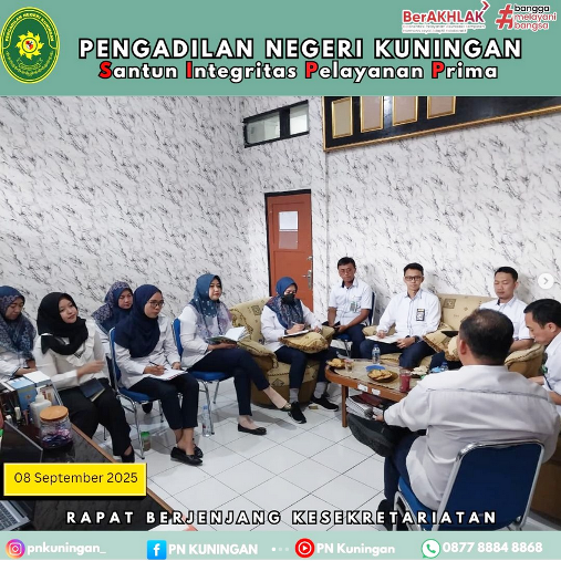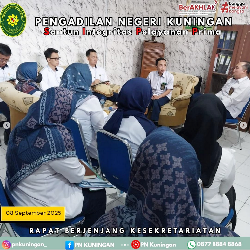 Bapak Jundy Eka Saputra, S.E.,M.M., selaku Sekretaris Pengadilan Negeri Kuningan memimpin Rapat Berjenjang Kesekretariatan bulan September 2025 bertempat di Ruang Sekretaris Pengadilan Negeri Kuningan.