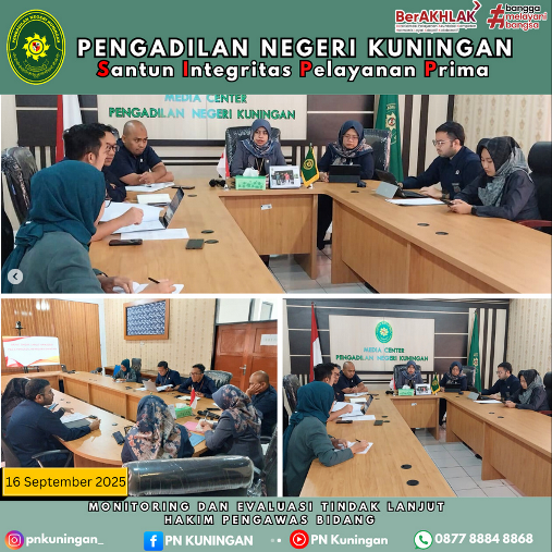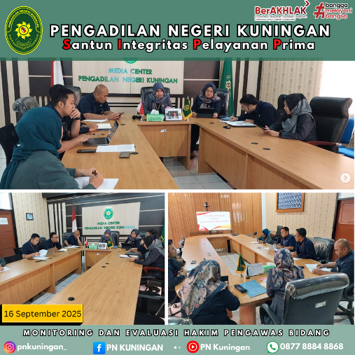 Ibu Tavia Rahmawati Suki, S.H., M.H., selaku Wakil Ketua Pengadilan Negeri Kuningan memimpin Rapat Monev Hakim Pengawas Bidang dan Monev Tindak Lanjut Hakim Pengawas Bidang, yang bertempat di Ruang media Center Pengadilan Negeri Kuningan.