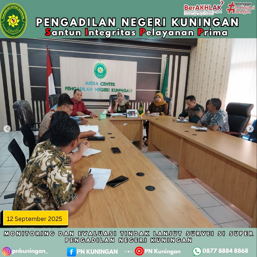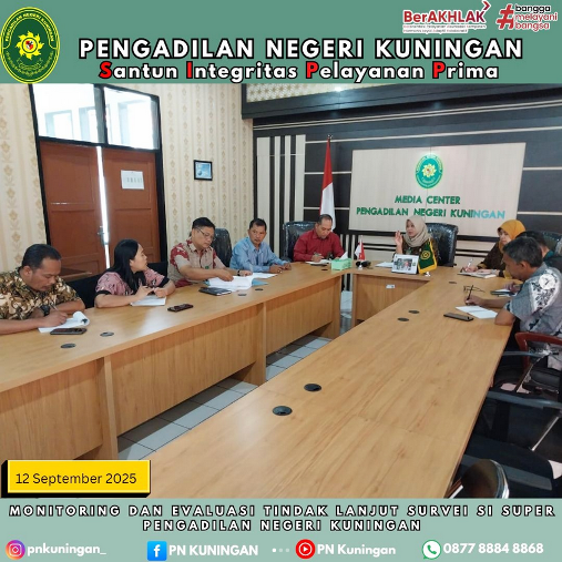 Ketua Pengadilan Negeri Kuningan Ibu Ardhianti Prihastuti, S.H.,M.H. didampingi Wakil Ketua Pengadilan Negeri Kuningan Ibu Tavia Rahmawati Suki Memimpin Rapat Monitoring dan Evaluasi Tindak Lanjut Survei Si Super Pada Pengadilan Negeri Kuningan.
