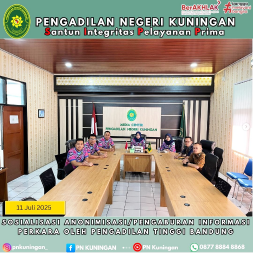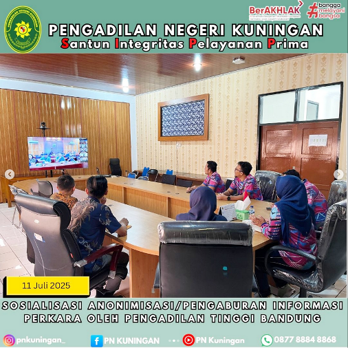 Bertempat di Ruang Media Center Pengadilan Negeri Kuningan, Telah dilaksanakan Sosialisasi Anomisasi/Pengaburan Informasi Perkara oleh Pengadilan Tinggi Bandung Secara Daring (Meeting Zoom) yang diikuti Oleh Ketua Pengadilan Negeri Kuningan Ibu Ardhianti Prihastuti,S.H.,M.H., Wakil Ketua Pengadilan Negeri Kuningan Ibu Tavia Rahmawati Suki, S.H., M.H. Beserta Jajaran Hakim, Plh Panitera, Para Panitera Muda, serta Tim Informasi Teknologi Pengadilan Negeri Kuningan