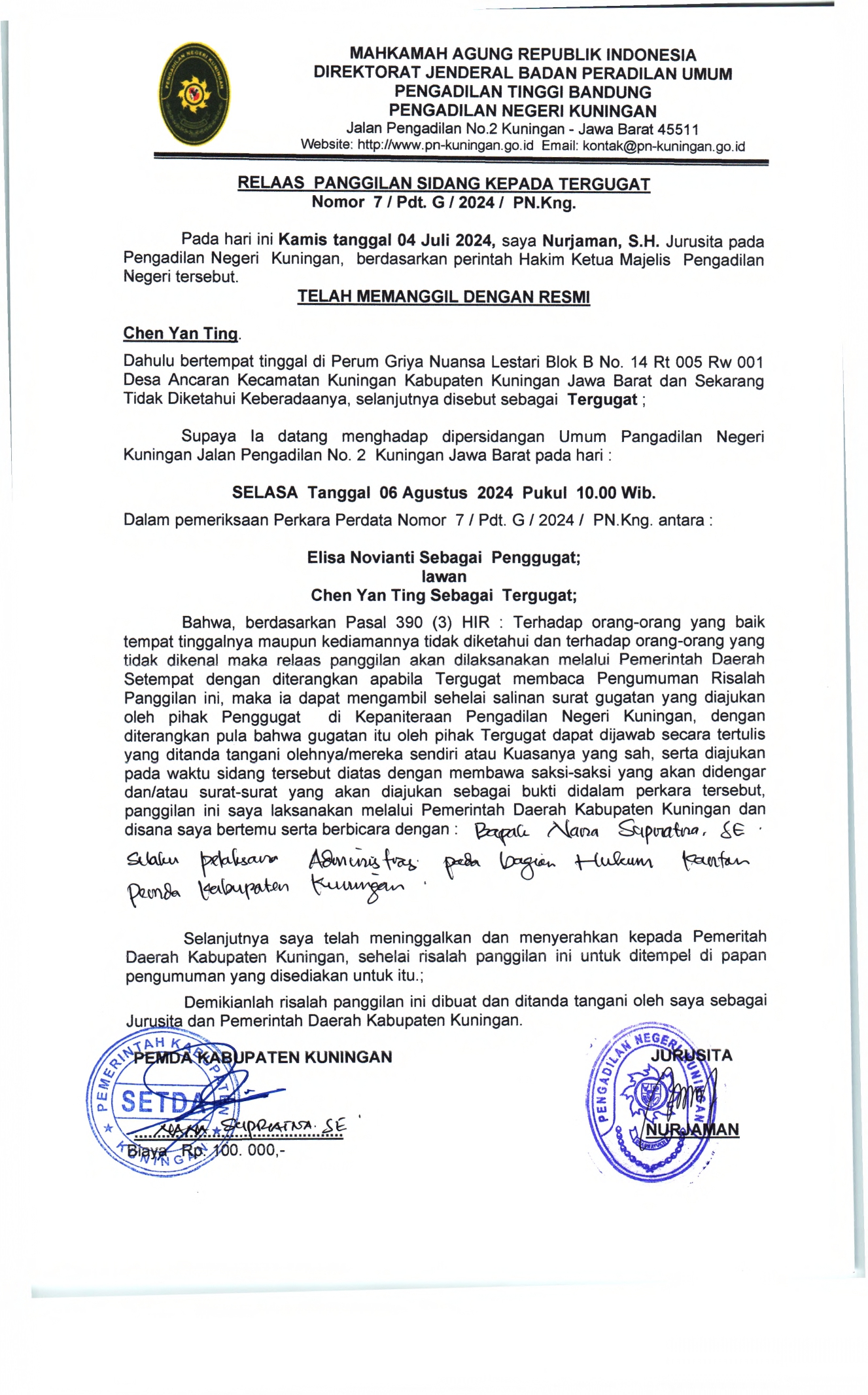 Surat Pemberitahuan Panggilan Sidang kepada CHEN YAN TING perkara Nomor 7/Pdt.G/2024