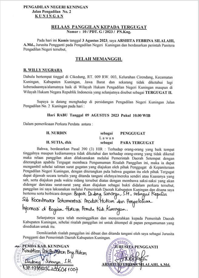 Surat Pemberitahuan Panggilan Sidang kepada R. WILLY NUGRAHA, dahulu bertempat tinggal di Cikedung, RT. 009 RW. 003, Kelurahan Cirendang, Kecamatan Kuningan, Kabupaten Kuningan, Jawa Barat dan sekarang tidak diketahui lagi keberadaannya/alamatnya baik di Wilayah Hukum Pengadilan Negeri Kuningan maupun di Wilayah Hukum Negara Republik Indonesia, sebagai Tergugat II dalam perkara Nomor 10/Pdt.G/2023 antara H. NURDIN sebagai Penggugat melawan H.SUTIA,dkk sebagai Para Tergugat untuk datang menghadap di sidang Pengadilan Negeri Kuningan pada hari Rabu tanggal 09 Agustus 2023.