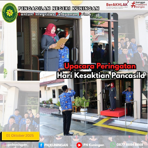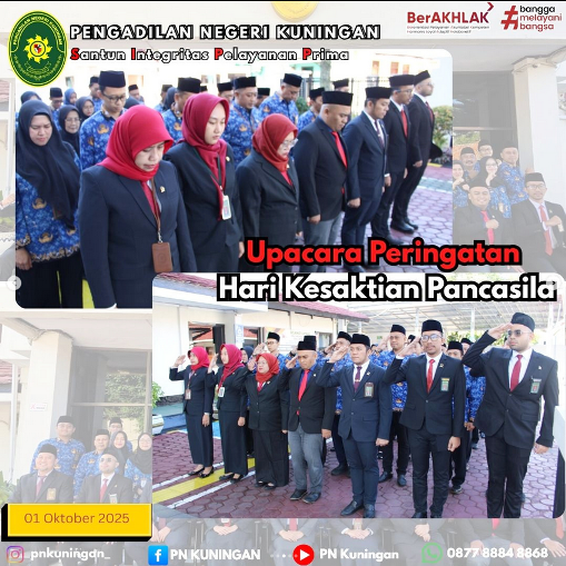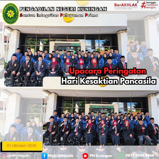 Upacara Peringatan Hari Kesaktian Pancasila Pengadilan Negeri Kuningan, Ketua Pengadilan Negeri Kuningan Ibu Ardhianti Prihastuti,S.H.,M.H. sebagai Inspektur Upacara dan diikuti oleh seluruh Keluarga Besar Pengadilan Negeri Kuningan bertempat di Halaman Gedung Kantor Pengadilan Negeri Kuningan